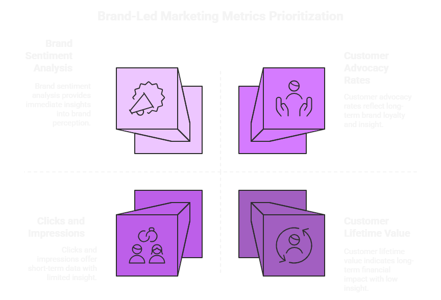 Conventional marketing metrics, such as clicks, impressions, and immediate conversion, can only take a share of the pie in brand-led marketing. Though the metrics are important, they would not present an entire picture of what emotional branding and long-term brand building can convey.
