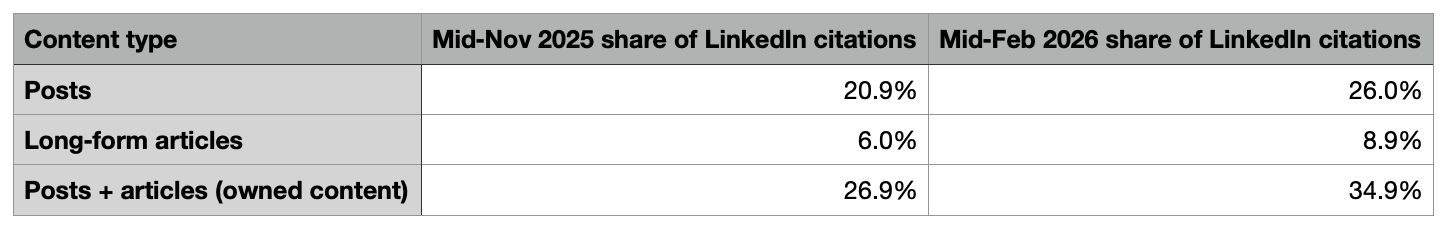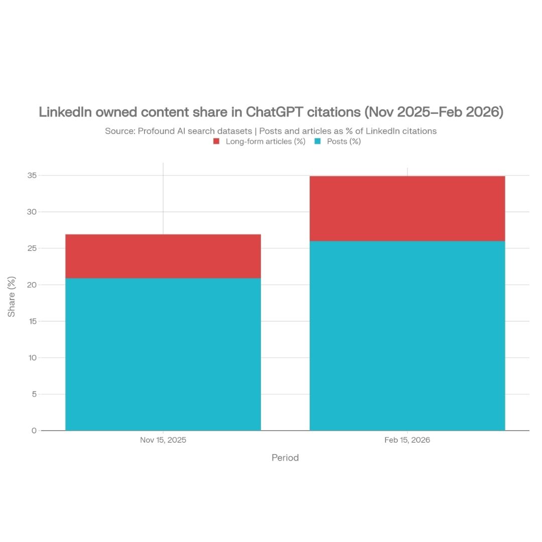 This means more than one in three LinkedIn URLs cited by ChatGPT are now posts or articles, not just company homepages or profiles.
