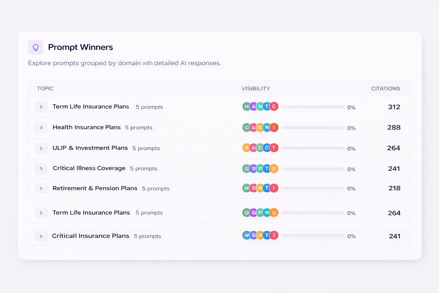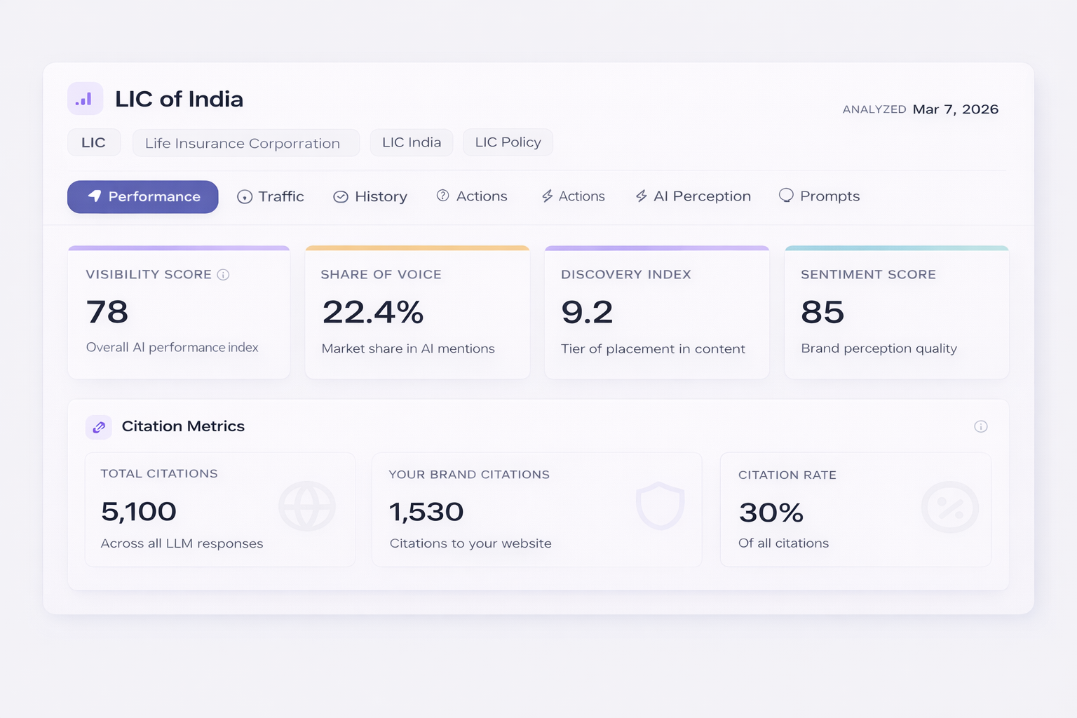 From an AI visibility standpoint, LIC is the most mentioned insurance brand across all five platforms tested — unsurprisingly. What is notable, however, is that LIC consistently appears at the top of AI responses even for queries where a private insurer might offer a more technically accurate recommendation. Brand legacy translates directly into AI mindshare.