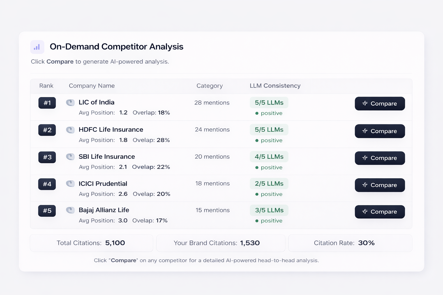 Our AI intelligence team ran over 10,000 structured prompts across ChatGPT, Claude, Perplexity, Microsoft Copilot, and Google Gemini. The prompts spanned multiple categories: general consumer queries (e.g., "Which insurance company should I choose in India?"), research-oriented questions (e.g., "What are the top life insurance companies in India by market share?"), comparison queries (e.g., "LIC vs HDFC Life — which is better?"), and trust-signal questions (e.g., "Which insurance company has the best claim settlement ratio in India?").