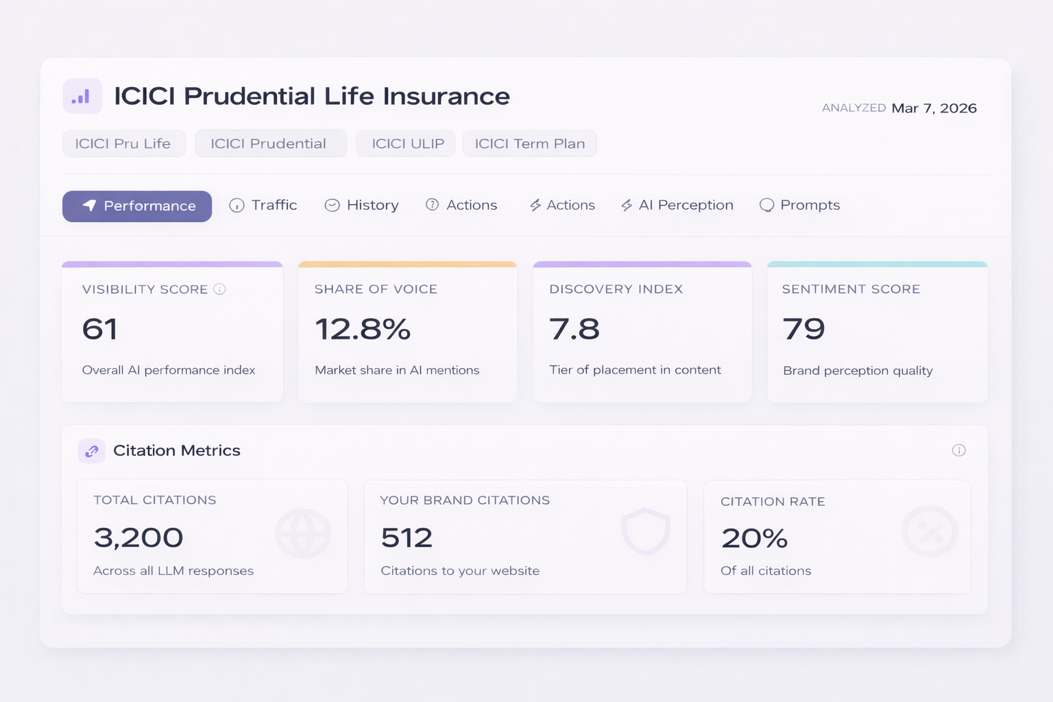 ICICI Prudential's AI visibility profile is notably strong in ULIP-related and investment-linked queries. The brand's long association with equity-linked insurance products and its broad digital distribution make it a frequent mention in responses to queries about insurance as a wealth-building instrument. This is an important distinction — the brand has successfully carved out a specific thematic corner within AI-generated insurance recommendations.