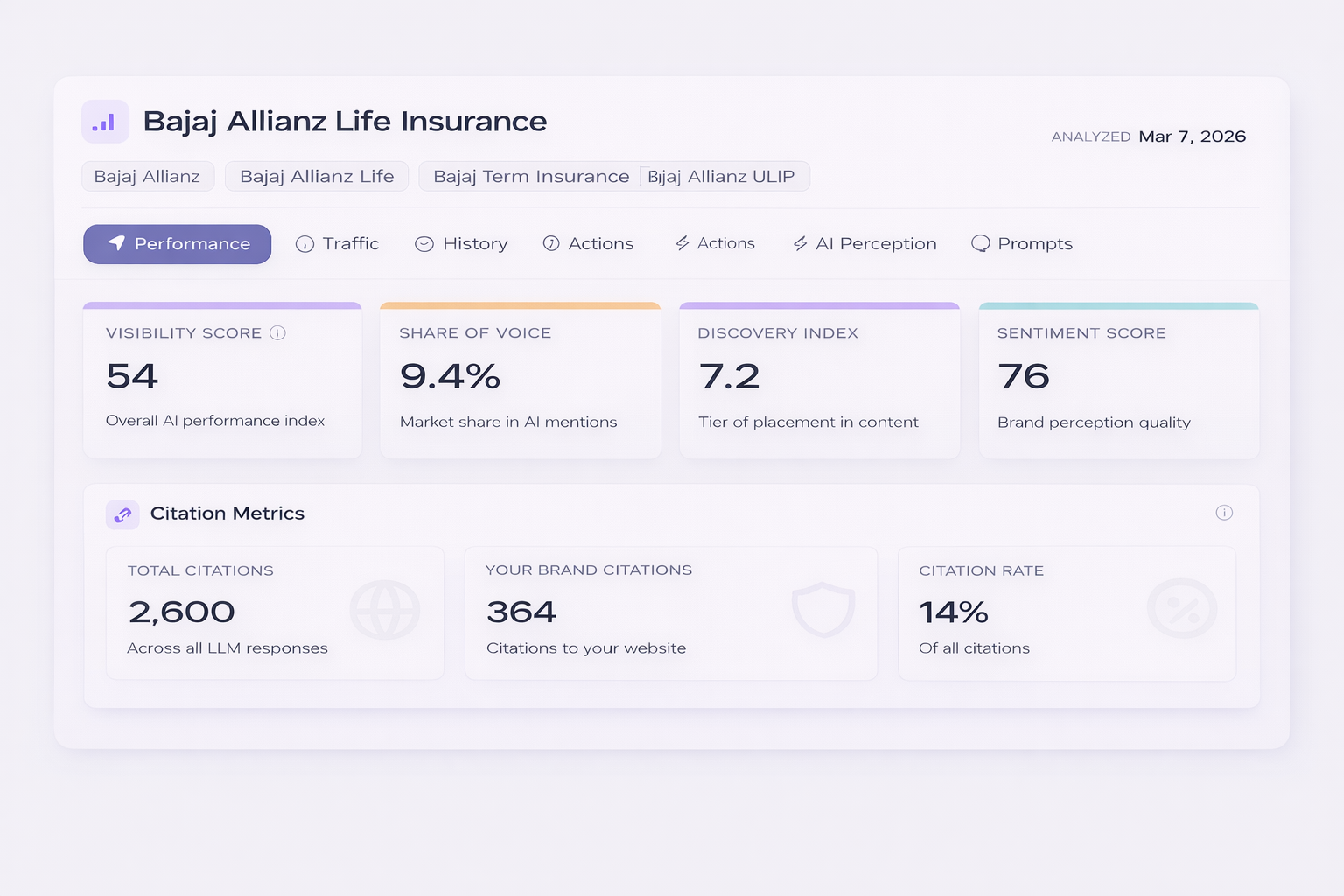 In IcyPluto's prompt testing, Bajaj Allianz appeared consistently in responses to queries involving term insurance and online policy purchase — suggesting strong brand-product association for digital-first consumers. The Allianz brand parentage also improves its AI visibility on queries where global credibility is a factor.